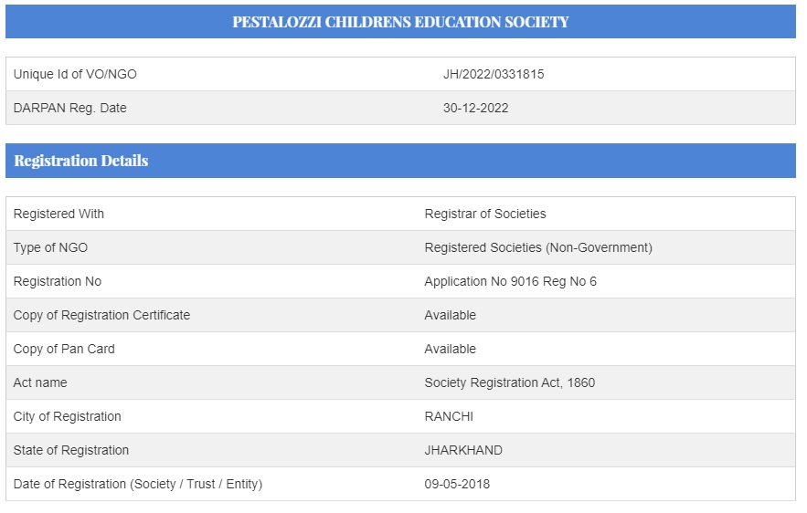 The NGO certificate awarded to Pestalozzi Children's Education Society recognizes its dedication to providing quality education and holistic development to underprivileged children. This certification acknowledges the society's compliance with legal standards and its impactful work in transforming lives through education and support for disadvantaged communities.